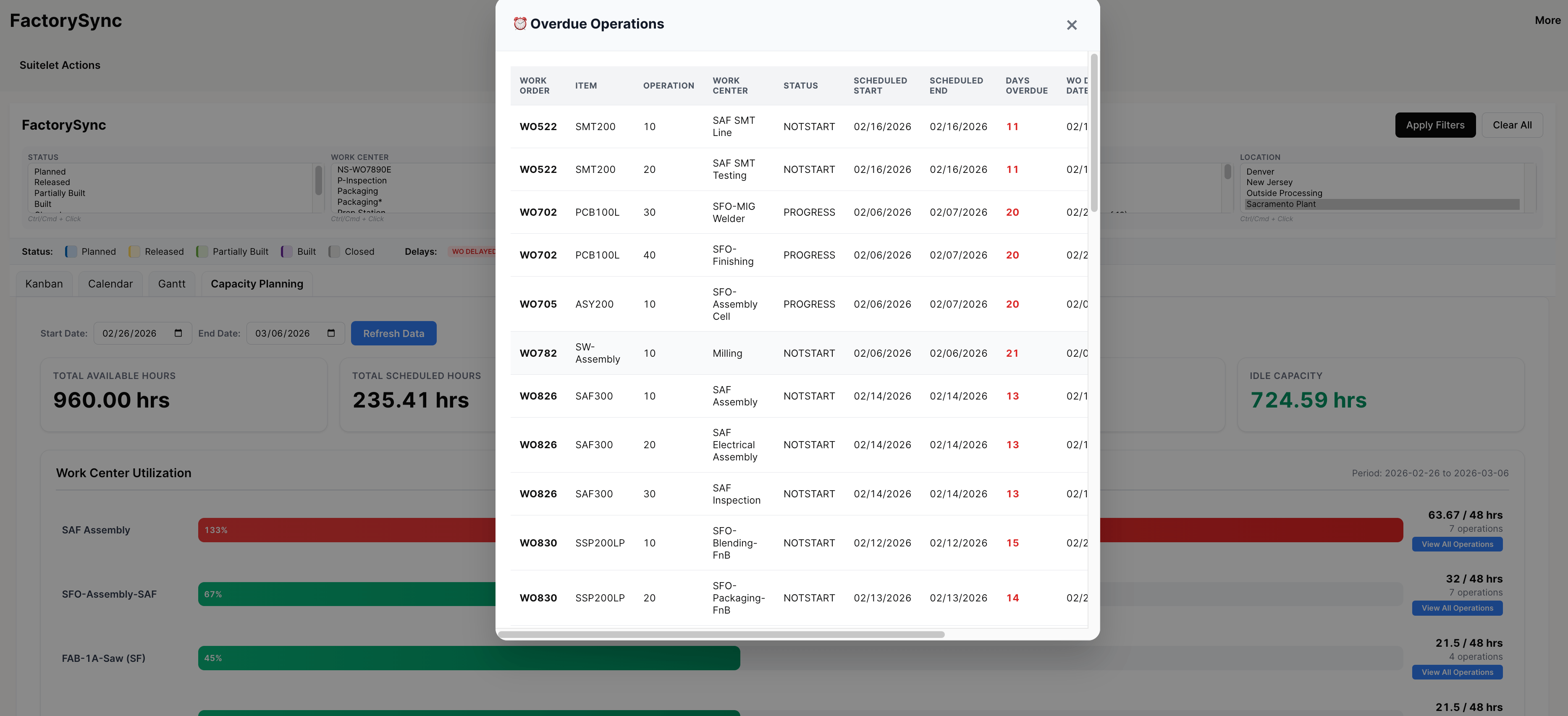 FactorySync’s capacity planner shows you utilization across all your work centers in real time. You can see at a glance which resources are overloaded and which have room. More importantly, you can see this before committing to a timeline, not after.
